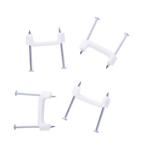 Paquete de 50 grapas para cables de nailon de alta resistencia, estilo de doble cabeza con vástago suave, grapas metálicas de plástico aisladas, clavos de acero